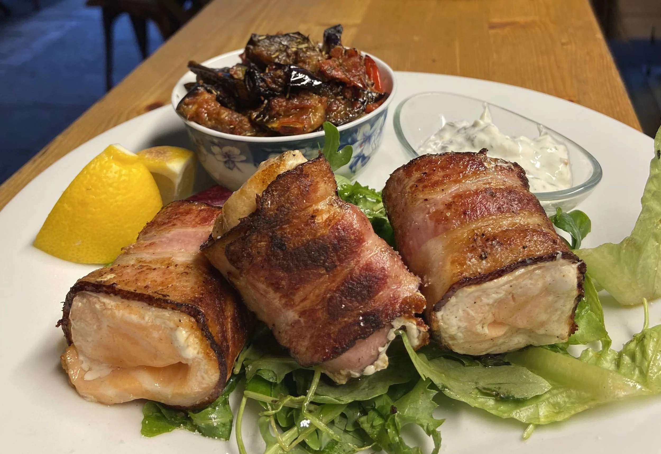 Grilované ”Kostky z lososa” zabalené do anglické slaniny nejlépe doplní příloha “Ratatouille” a zakysaná smetana s koprem